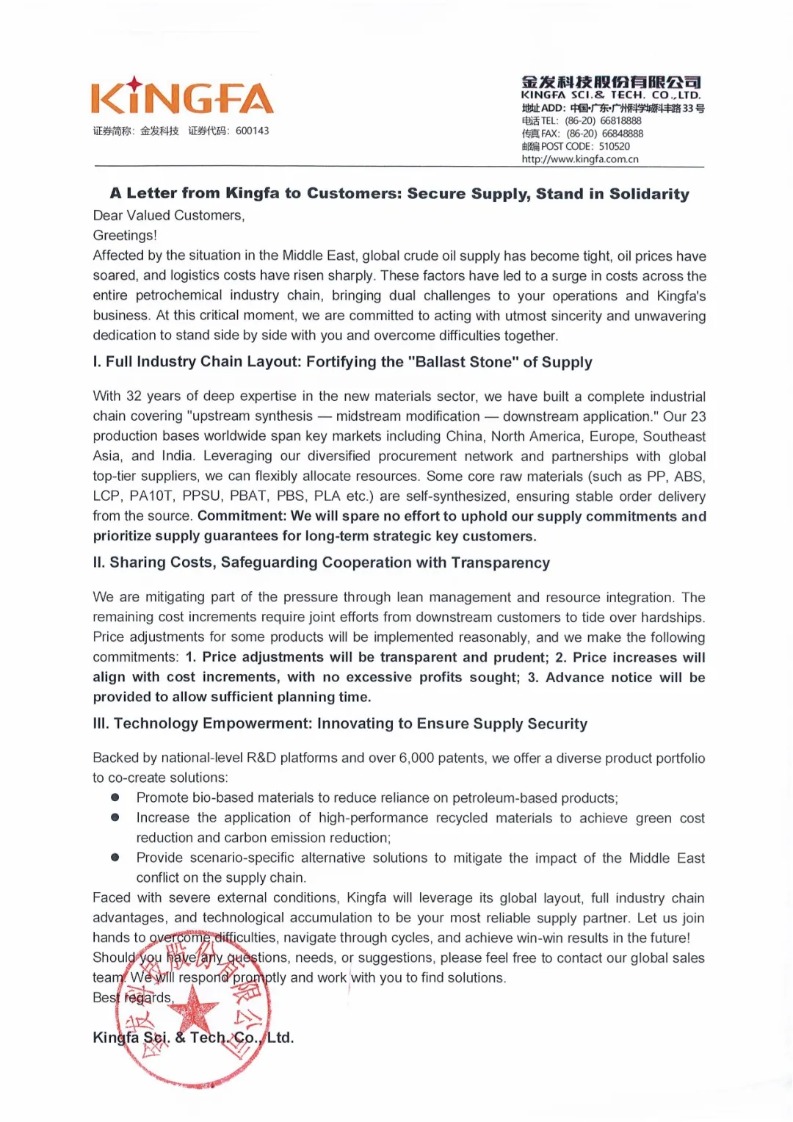 金发科技3月7日晚间在公司微信公众号发布致客户信,受中东局势影响,全球原油供应紧张、油价及物流成本攀升,行业成本激增,公司部分产品将上调价格。同时,公司承诺调价透明审慎,涨幅匹配成本增加,不牟取超额利润,并提前告知预留规划时间。