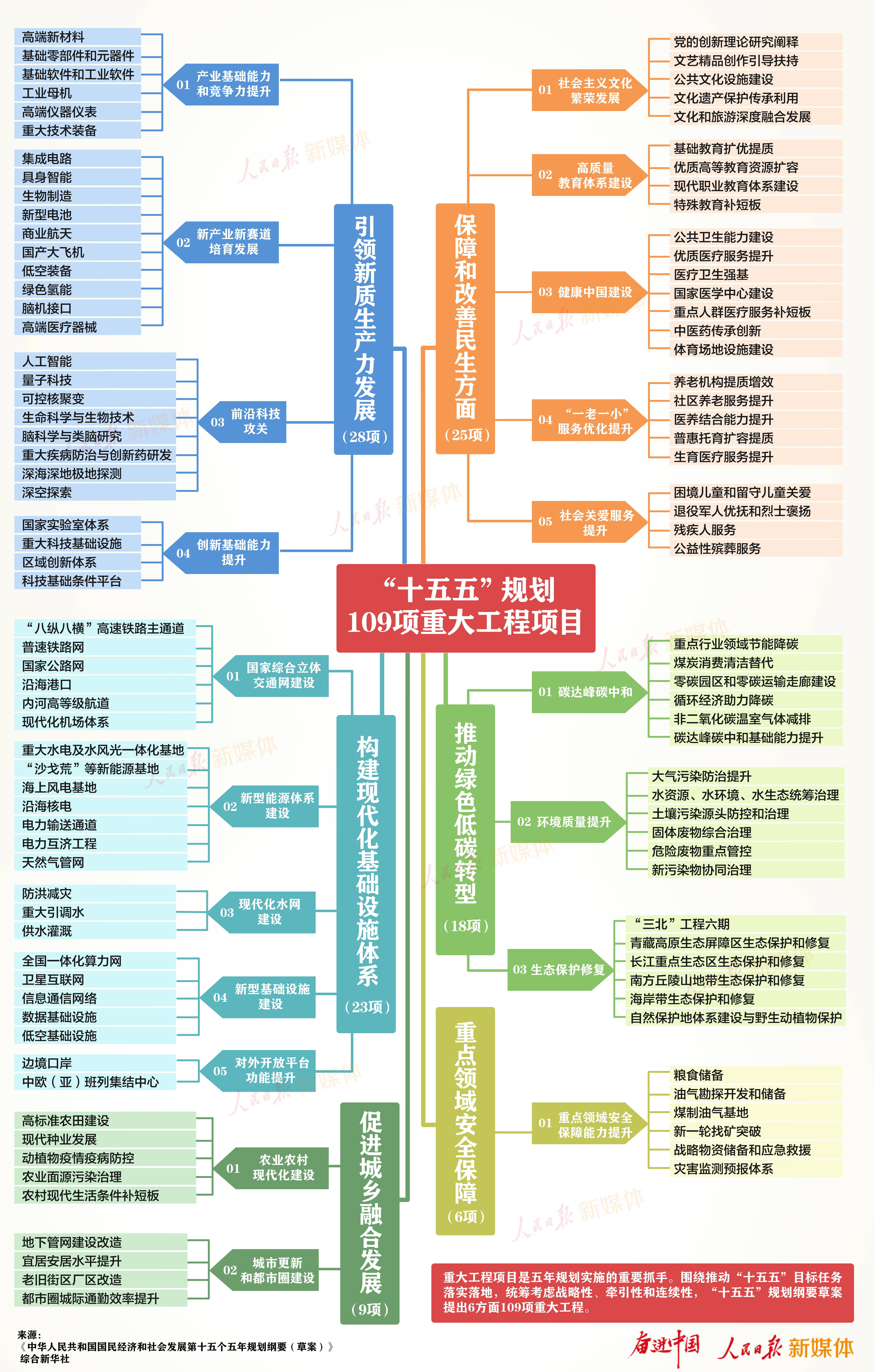 重大工程项目是五年规划实施的重要抓手。围绕推动“十五五”目标任务落实落地,统筹考虑战略性、牵引性和连续性,“十五五”规划纲要草案提出6方面109项重大工程。