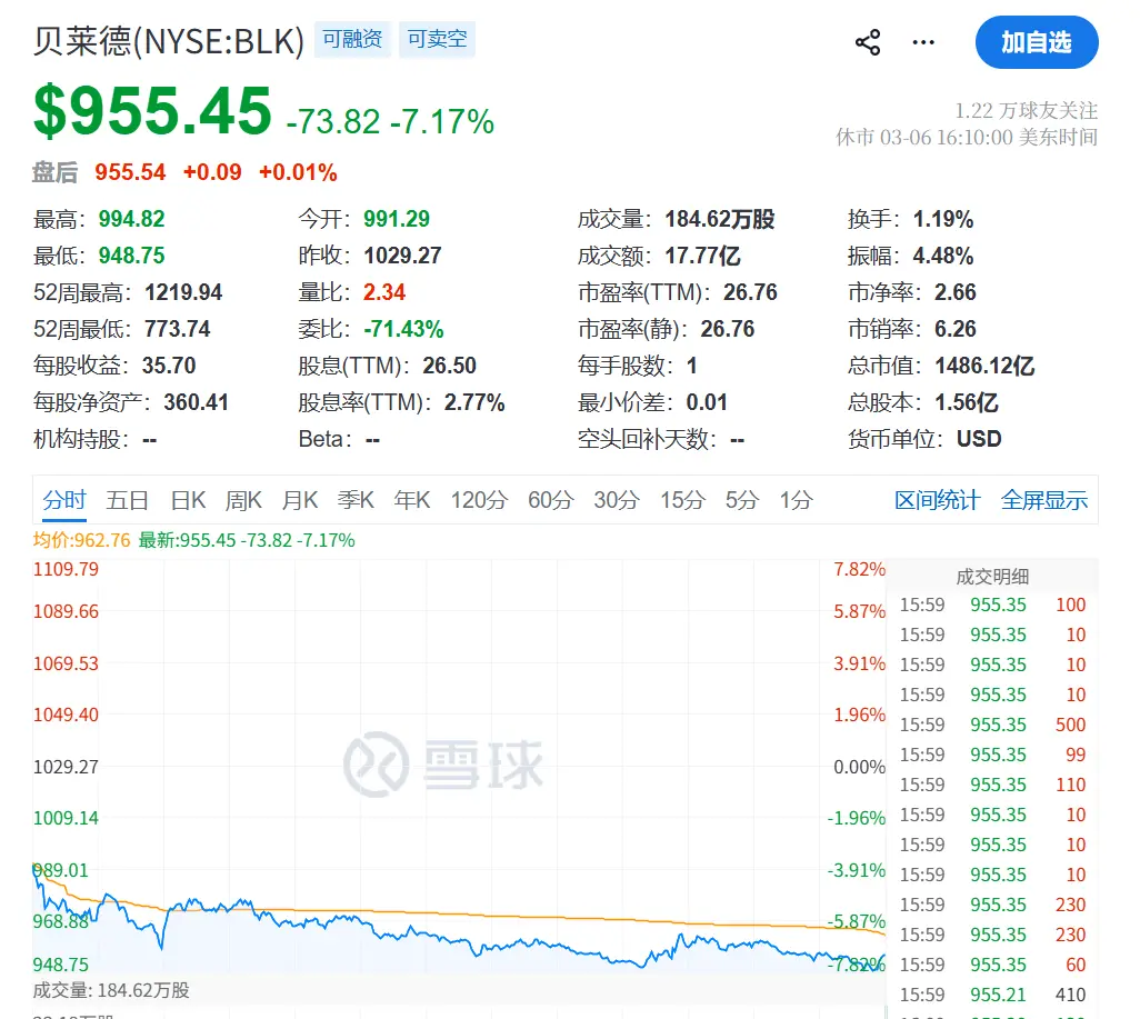 隔夜美股,全球最大的资产管理公司贝莱德,股价暴跌7%。