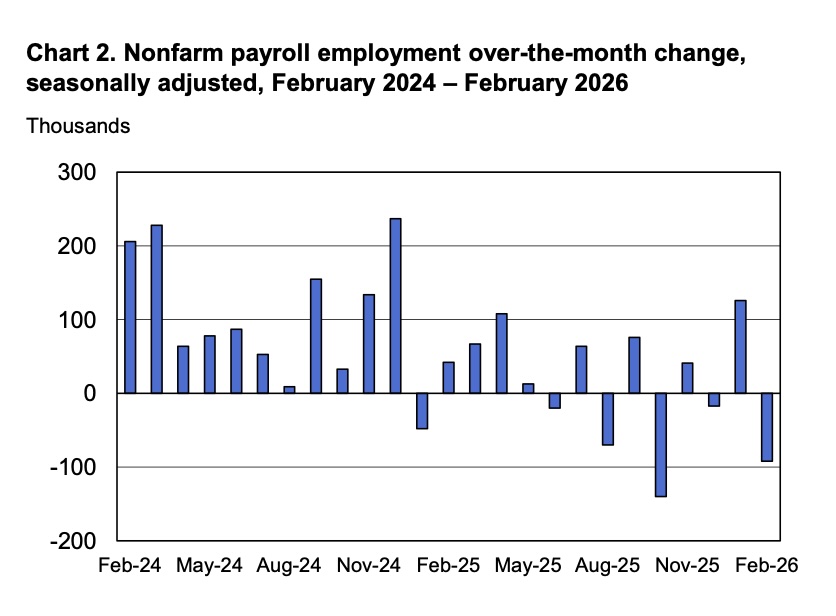 美国劳工部劳工统计局(BLS)周五发布的就业报告显示,2 月非农就业人数减少9.2万人,市场预期增加5.9万人;1月数据经下修后为增加12.6万人。