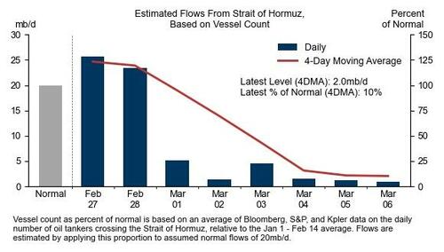 第一,高盛预计通过霍尔木兹海峡的石油流量已减少了1800万桶/日