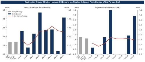 第二,高盛估计,过去四天通过管道以及延布港(沙特阿拉伯红海沿岸)和富查伊拉港(阿联酋阿曼湾沿岸)的净改道量仅为90万桶/日(对比理论估计的360万桶/日潜在能力)。