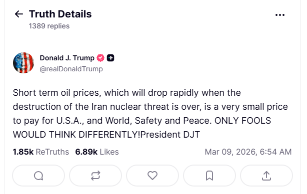 “短期油价上涨,对于美国乃至世界的安全与和平而言,这只是微不足道的代价。只有傻瓜才会持不同看法!”他写道。