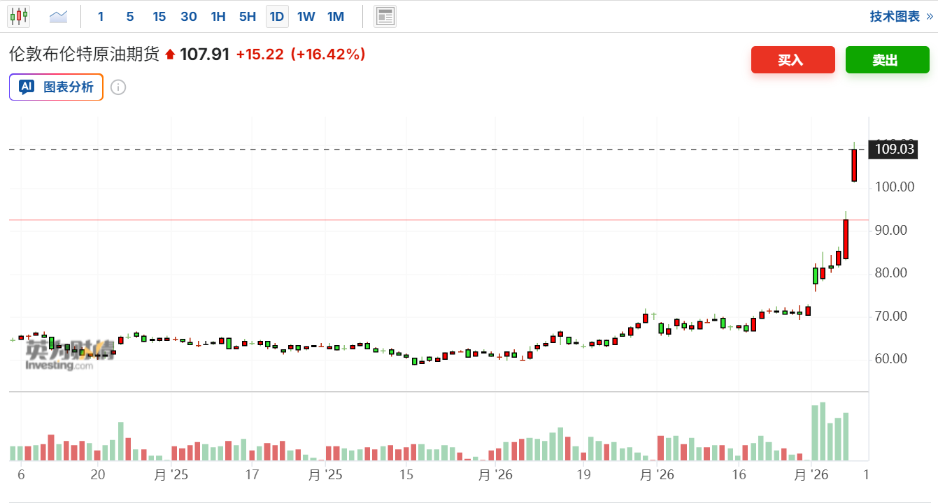 WTI原油期货向上触及110美元/桶,最新报111.0美元/桶,日内上涨22.11%。布伦特原油期货向上触及110美元/桶,最新报110.263美元/桶,日内上涨18.96%。而上一次油价突破每桶100美元大关,还是在2022年俄乌冲突爆发之后。