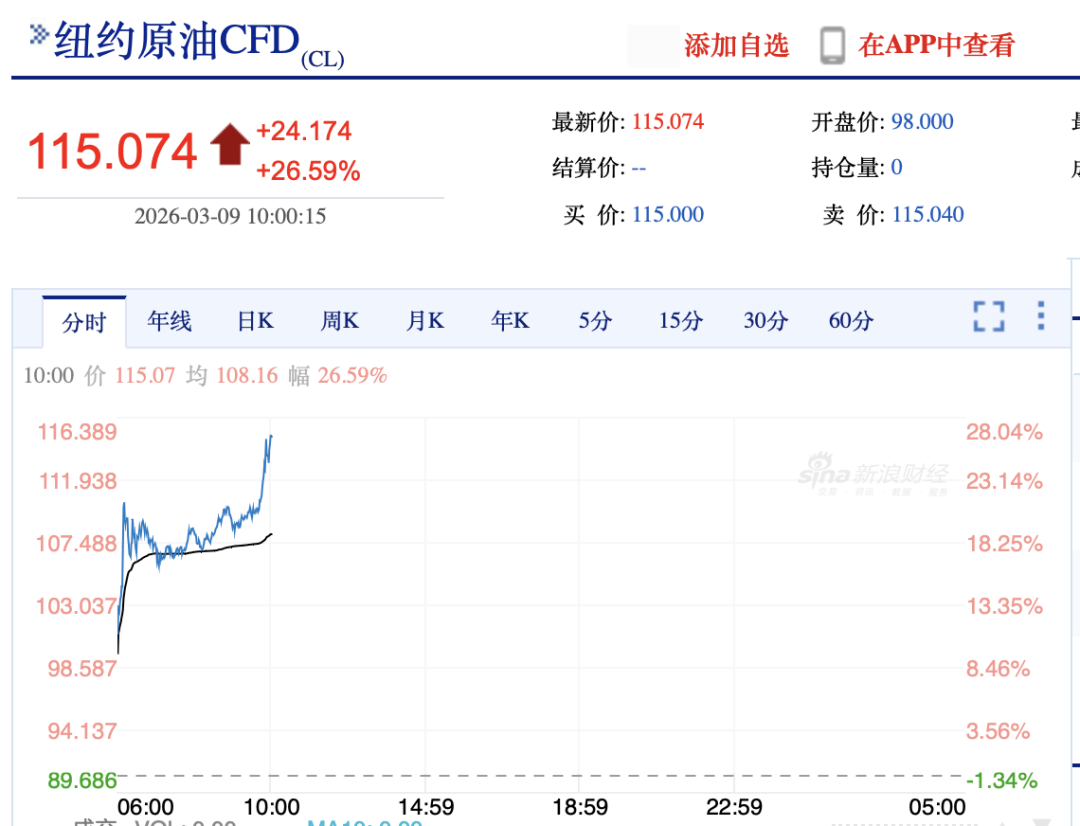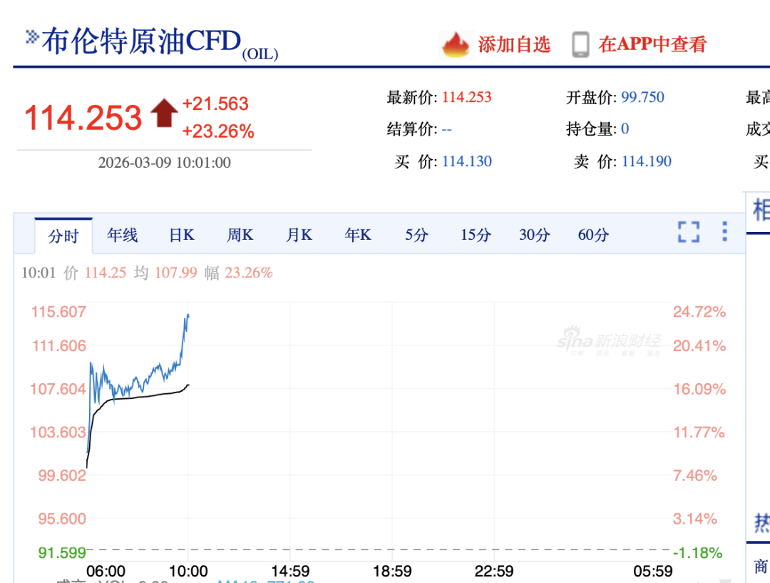 国内油气板块强势拉升,主要源于国际油价暴涨。3月9日,美国原油和布伦特原油期货盘中均突破每桶111美元。截至界面新闻发稿前,美国原油期货价格每桶突破115美元,涨幅为26.59%;布伦特原油期货价格每桶突破114美元,涨幅为23.26%。