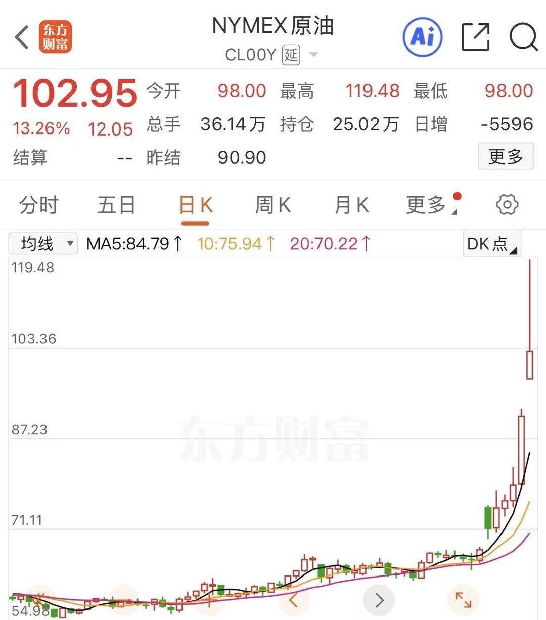 3月9日,WTI原油期货向上触及110美元/桶,截至发稿,最新报102.95美元/桶,日内上涨近13%。布伦特原油期货一度触及118美元/桶,截至发稿,最新报108.93美元/桶,日内上涨超17%。