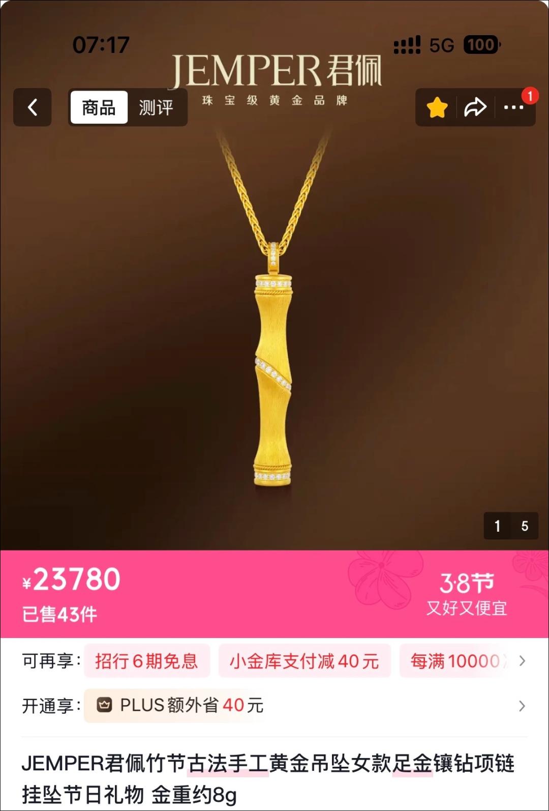 除了竹节手镯,同系列8克左右的竹节项链,昨天价格是15100元,今天调整后的价格为23780元,按克价接近3000元/克。