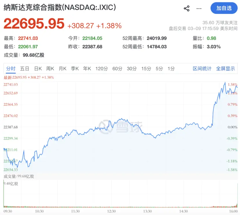 北京时间3月10日凌晨,美股三大指数尾盘直线猛拉,截至收盘,道指涨0.50%,标普500指数涨0.83%,纳指涨1.38%。当天盘初,道指一度大跌近2%,纳指、标普500指数一度跌超1%。