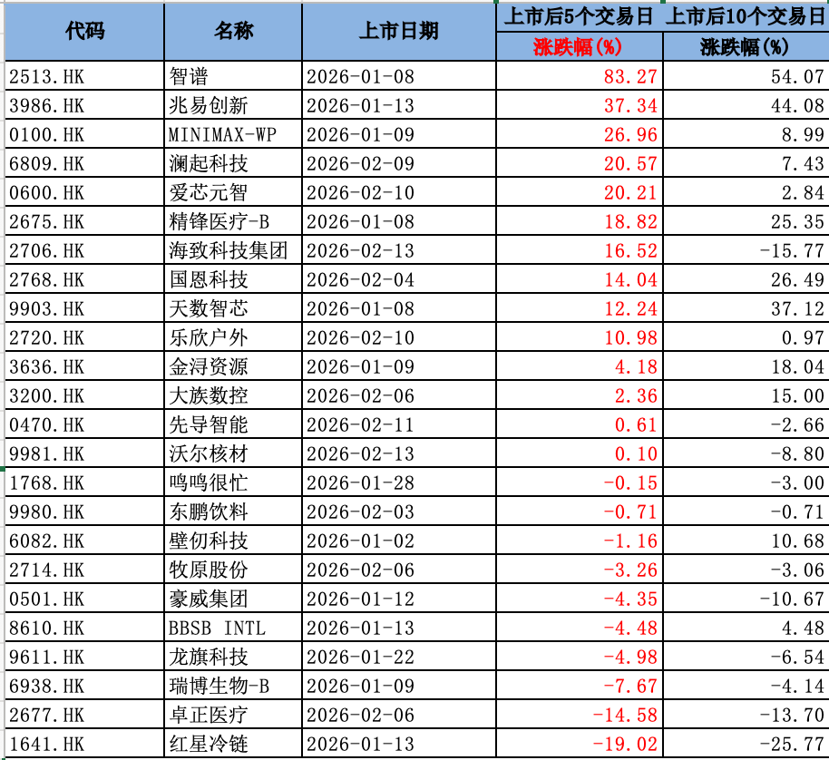 拉长时间维度,2026年以来港股IPO市场呈现显著的“冰火两重天”格局。Wind数据显示,年内上市的27只新股中,仅上述2只在上市首日破发。不过,若观察上市后5个交易日表现,跌破发行价的个股扩大至10只,其中红星冷链下跌19.02%,卓正医疗下跌14.58%。与此同时,以AI概念股为代表的“新贵”则涨势凌厉:智谱、兆易创新、MINIMAX-WP在上市后5个交易日内分别飙升83.27%、37.34%和26.96%。