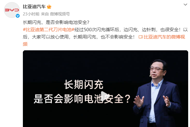有网友认为,闪充这么快,换电的价值不大了。也有网友表示,闪充对电网不好,而且过快的充电速度是否会损伤电池寿命、影响安全性和可靠性。面对争议,3月8日到3月9日,比亚迪官方微博连发4条视频对新技术进行说明。