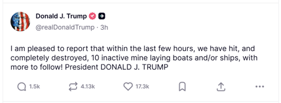 特朗普随后不久又发布了一则帖子,称美军已 “彻底摧毁” 10 艘处于非活跃状态的伊朗布雷船,后续还将有更多行动。