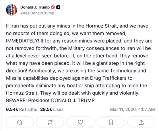 “如果伊朗在霍尔木兹海峡布设了任何水雷——尽管我们尚未收到相关报告——我们要求他们立即清除!”特朗普写道。