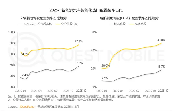 中国新能源汽车数据库QuestAuto数据显示,2025年12月全价位段市场L2级辅助驾驶配置装车占比达到77.3%,较年初的64.3%实现显著提升,10万元以下价位段市场也从17.4%增长至37.8%,呈现出明显的智驾平权趋势。