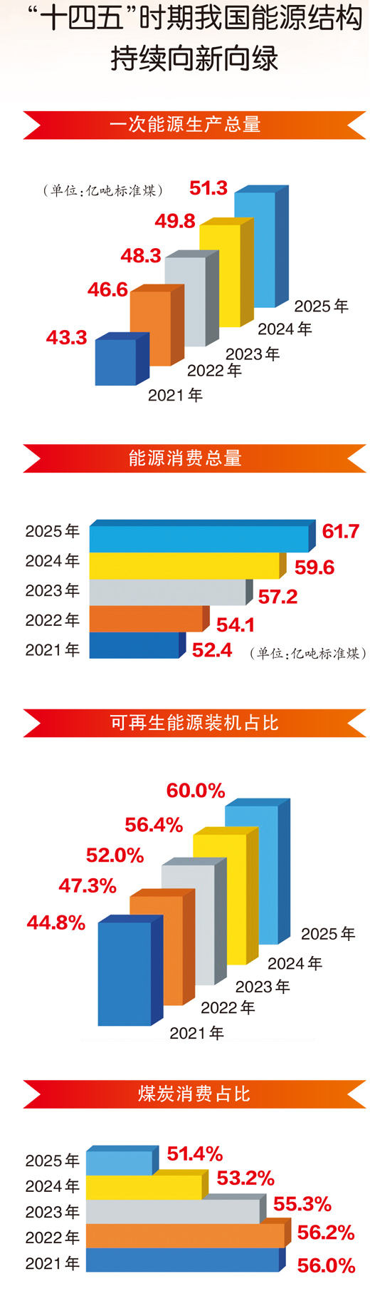 “十四五”时期,我国能源自给率从80%左右增至84%以上,能源体量规模稳居世界第一。煤油气“压舱石”作用稳定,“新主角”表现亮眼。5年间,我国以风光为代表的新能源发展速度前所未有,累计装机规模达到2020年底的3.4倍,电量占比累计提升12个百分点以上。