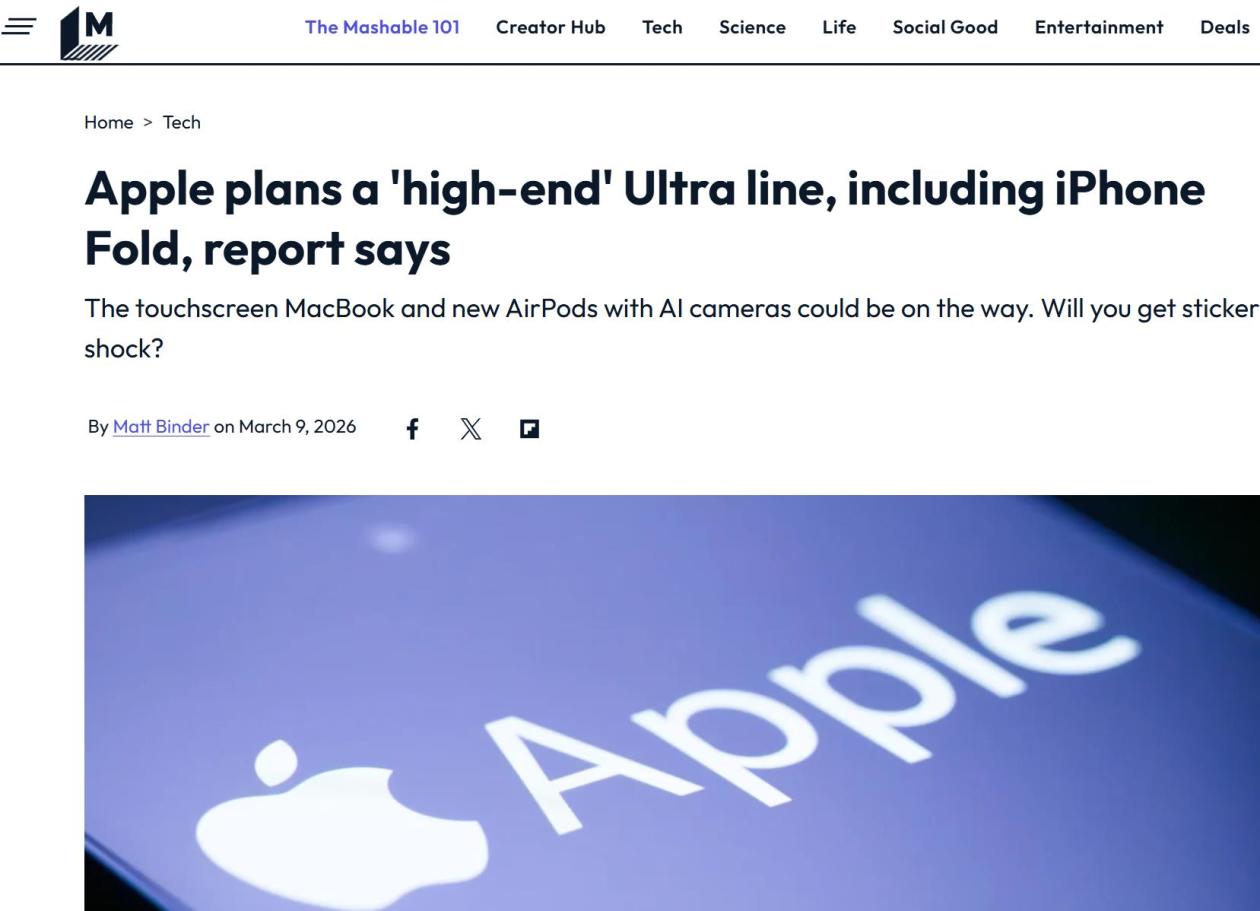 据mashable援引彭博社报道称,在上周推出售价低至599美元的平价笔记本电脑MacBook Neo之后,苹果公司正紧锣密鼓地筹备其高端产品战略的下一步重大举措。