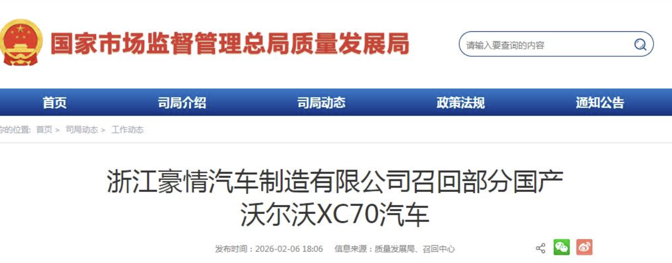 今年2月6日消息,豪情汽车召回2025年5月7日至2025年12月22日期间生产的部分国产四驱XC70汽车,共计14768辆。本次召回范围内的部分车辆,由于设计及制造原因,左后半轴存在适配性偏差。极端情况下,左后半轴可能从后驱动电机中松脱,存在安全隐患。