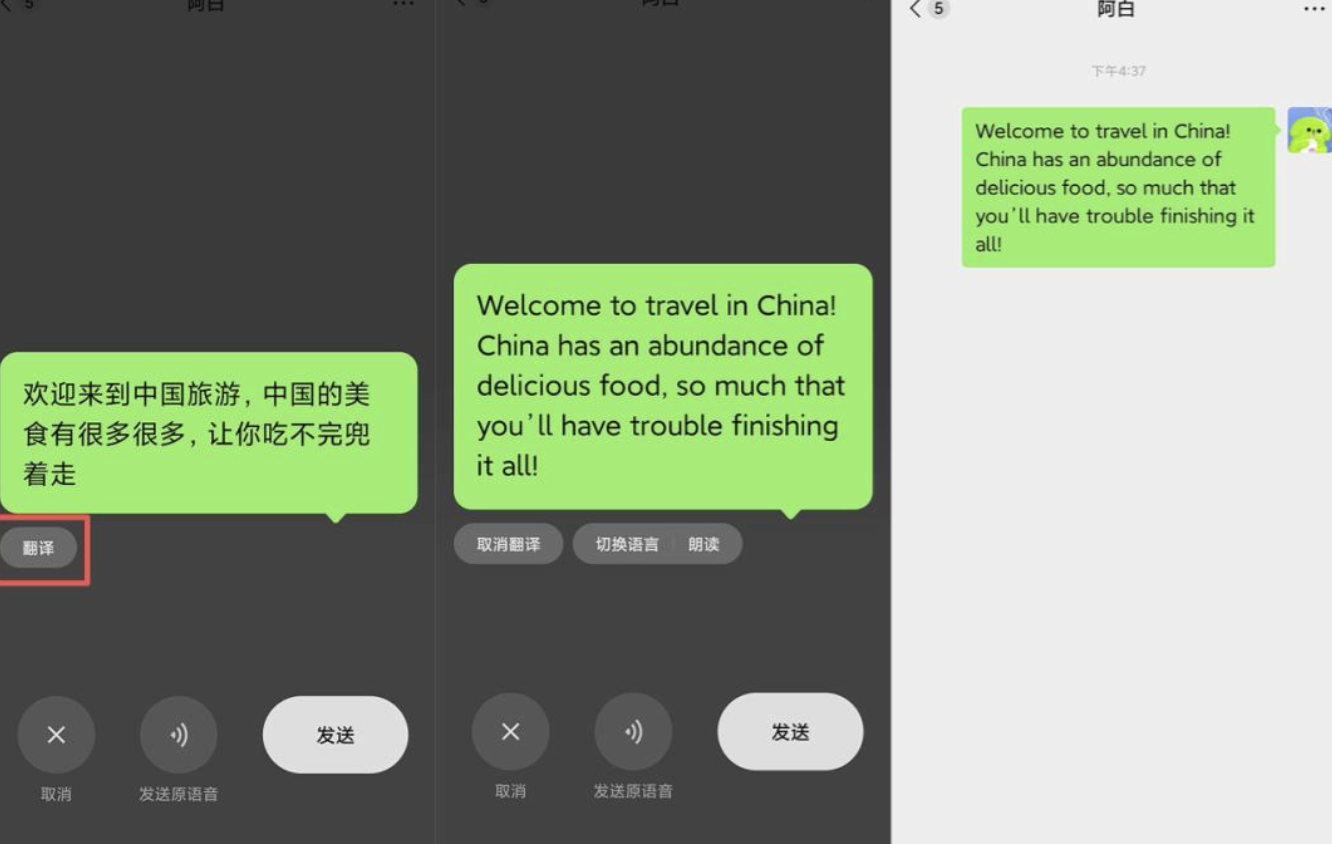 2.地道的洋文:微信语音转文字也带“同声传译”了。微信聊天说完语音后,左下角点击“翻译”按钮,语音自动翻译成你想唠的语言。
