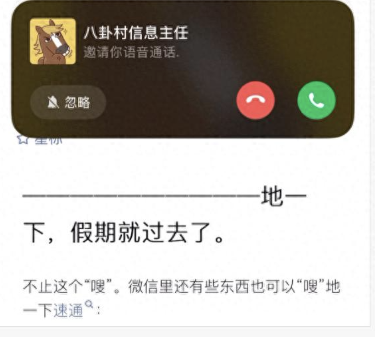 1.隐身的弹窗:面对意料之外的微信通话,如何优雅表演“我没看手机”?现在,有暂时不想接的微信语音 / 视频,点击“忽略”即可。点击后,你的弹窗消失了,对方也不会收到“已拒绝”,可能以为你“真没看到”。
