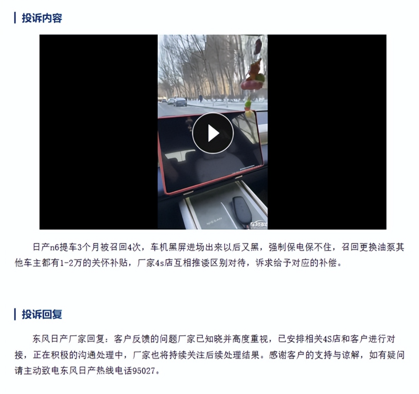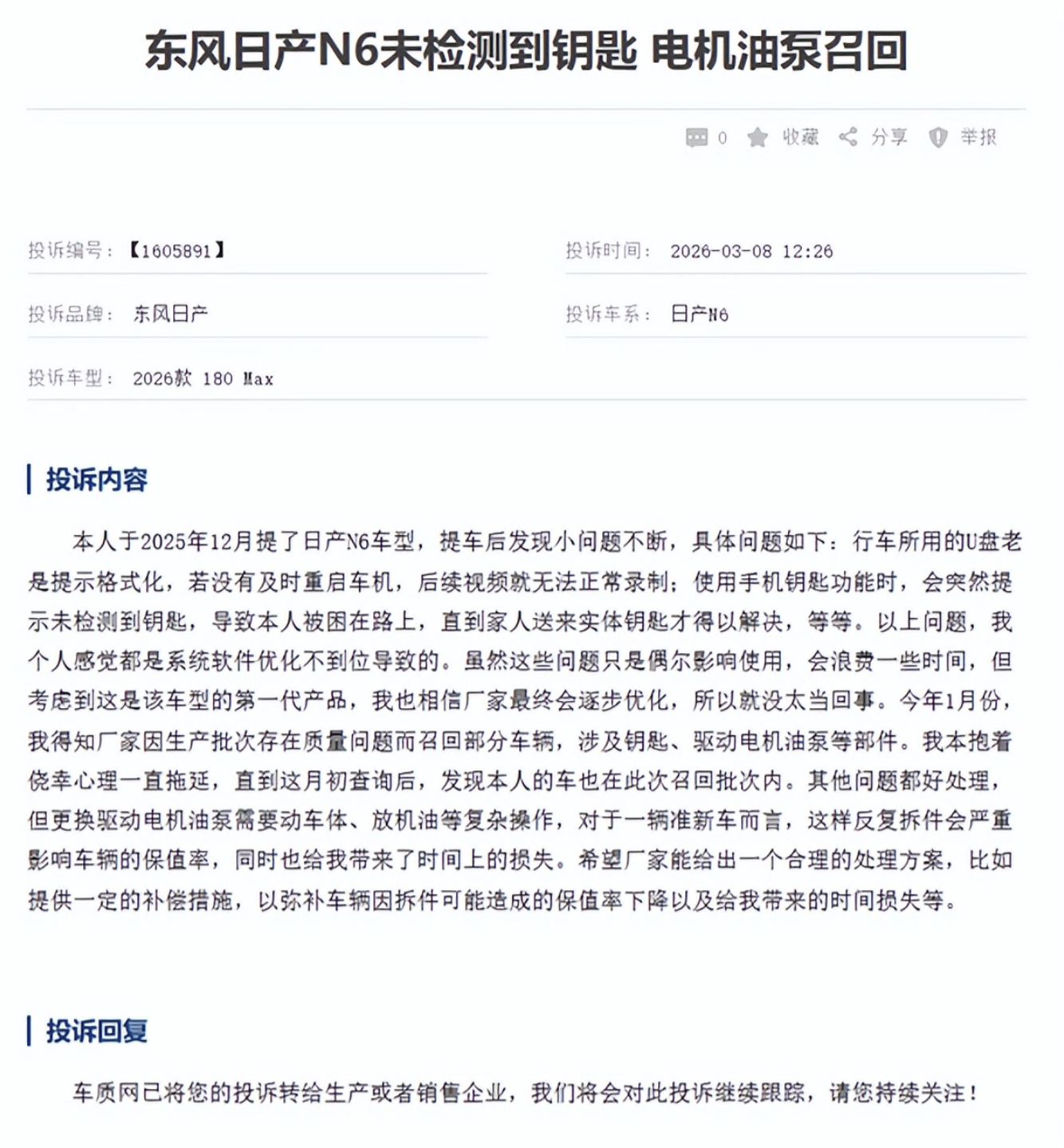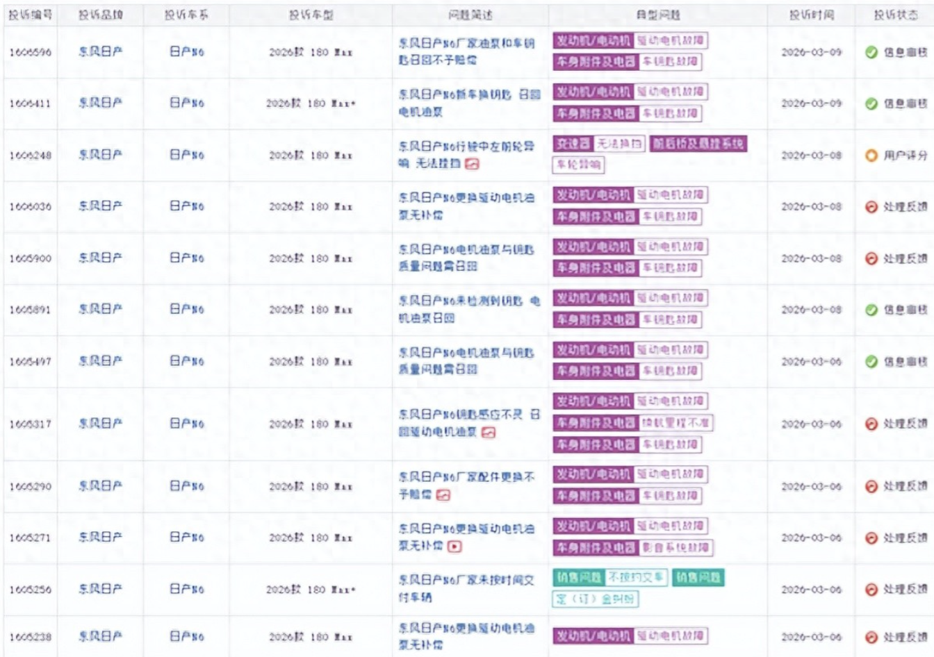 3月10日,记者从第三方投诉平台车质网了解到,东风日产N6近期投诉量激增,核心诉求集中在车辆召回后厂家未提供任何补偿,且新车本身故障频发。