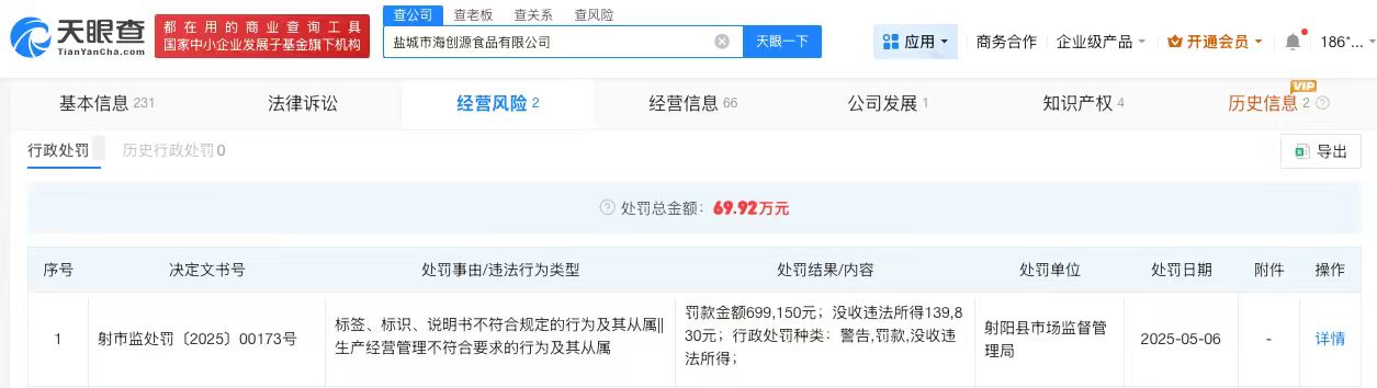 天眼查App显示,遭315晚会曝光的盐城市海创源食品有限公司成立于2020年3月,法定代表人为王丽莉,注册资本500万人民币,经营范围包括食品生产、水产品冷冻加工、水产品收购、水产品批发等。股东信息显示,该公司由王丽莉、王兵共同持股。行政处罚信息显示,2025年5月,该公司因标签标识不符合规定及生产经营管理不符合要求,被射阳县市场监督管理局罚款约69.9万元,没收违法所得约14万元。