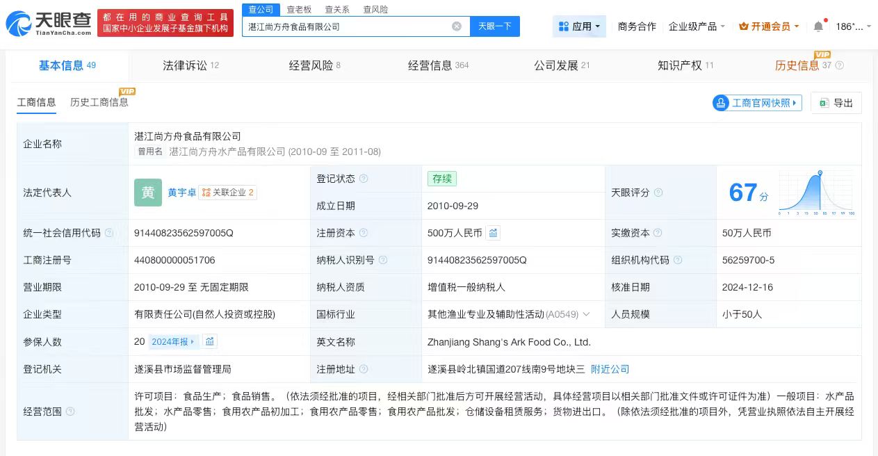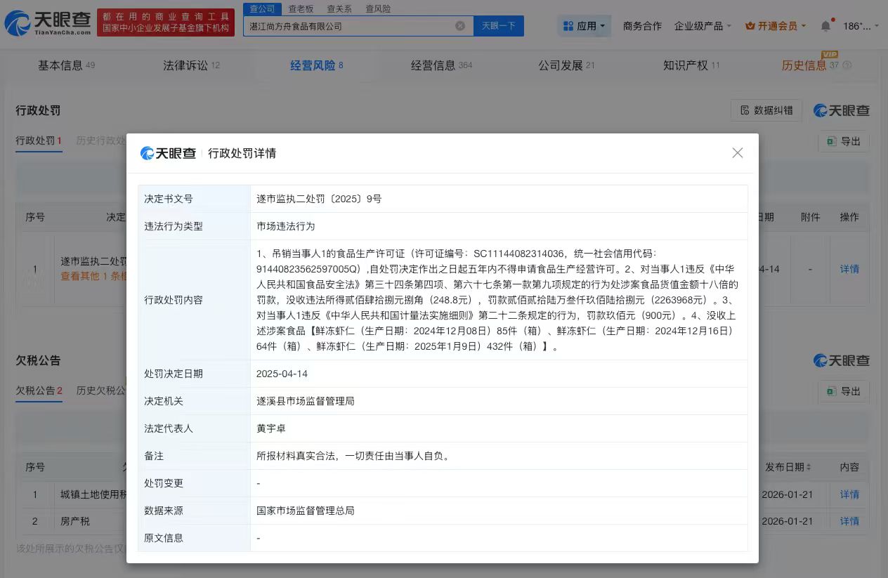 另一家遭315晚会曝光的湛江尚方舟食品有限公司成立于2010年9月,法定代表人为黄宇卓,注册资本500万人民币,经营范围包括水产品批发、水产品零售等。股东信息显示,该公司由黄宇卓、黄马德共同持股。行政处罚信息显示,2025年4月,该公司被遂溪县市场监督管理局罚款约226万元,并被吊销食品生产许可证。