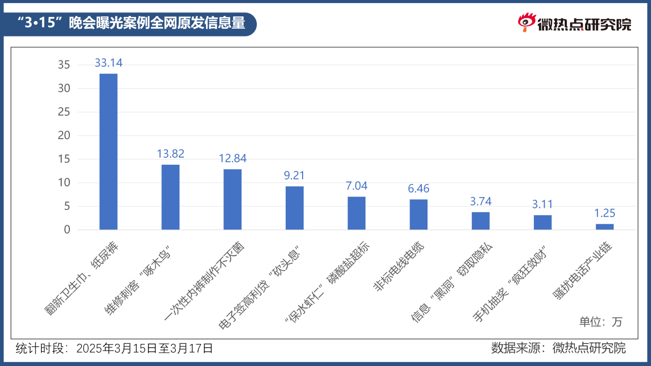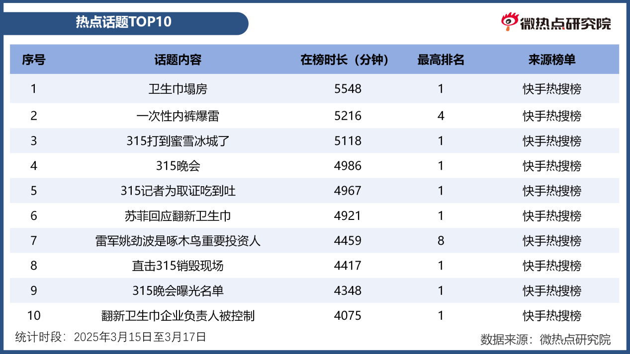 统计显示,3月15日至17日期间,共有905个“3·15”晚会相关话题登上快手、抖音等平台热点榜单,日均上榜话题超300个,侧面印证晚会曝光内容引发舆论高度聚焦。