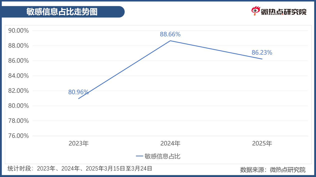 2025年敏感信息占比虽略有下降,但仍维持高位。2025年晚会相关敏感信息占比为86.23%,较2024年下降2.43个百分点,但连续三年保持在80%以上。