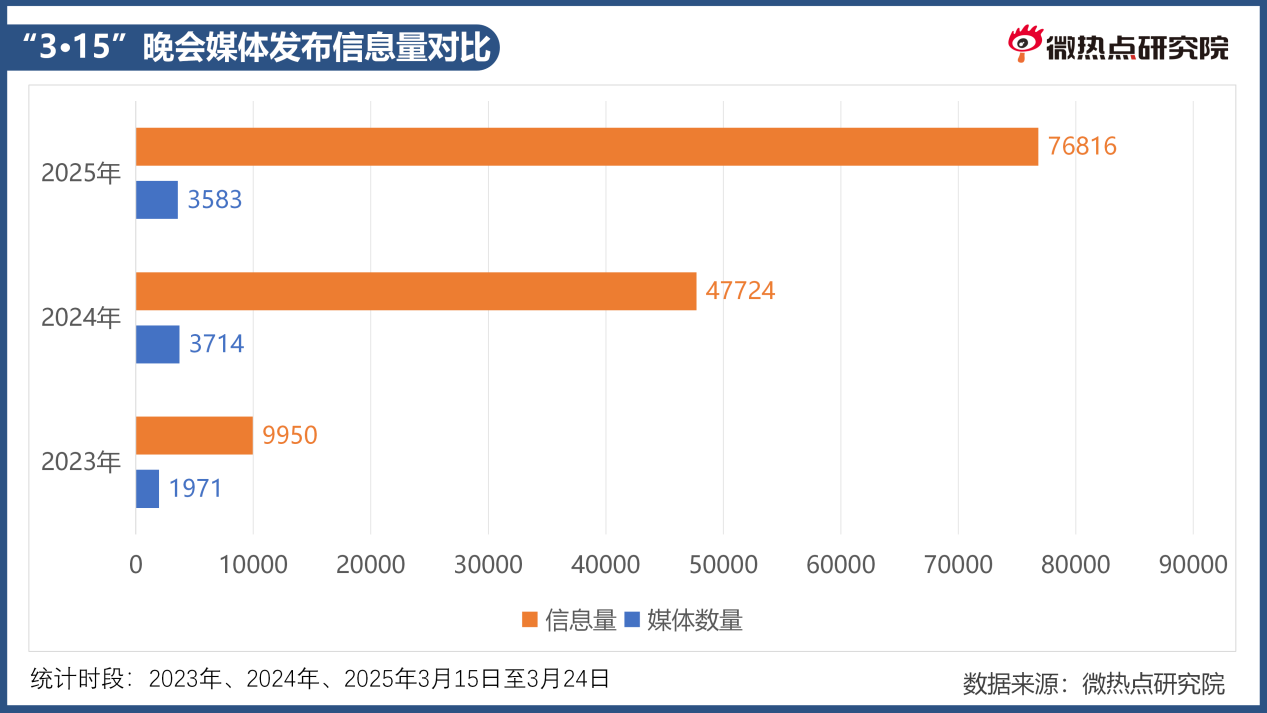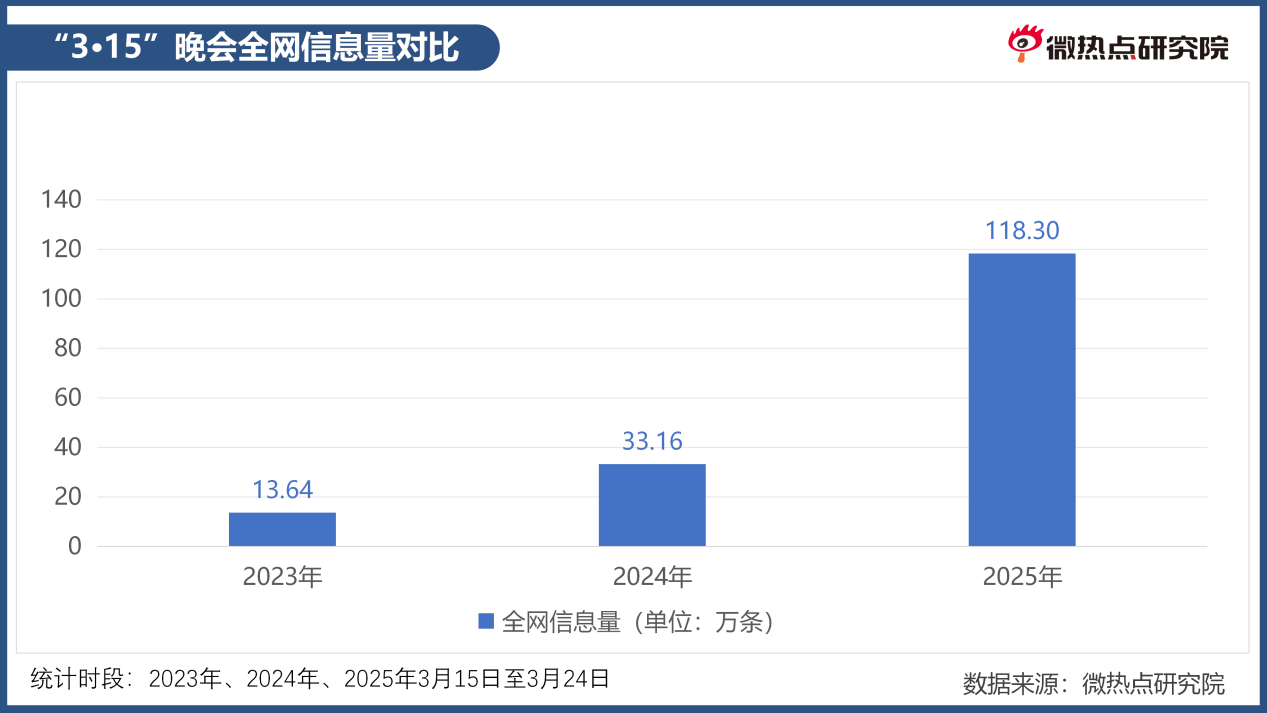 历史同期数据显示,“3·15”晚会的舆论影响力呈现稳步上升态势,全网信息量和媒体报道量均显著增长。2025年“3·15”晚会相关全网信息量达118.3万条,创历史新高,表明晚会引发广泛社会关注和讨论。