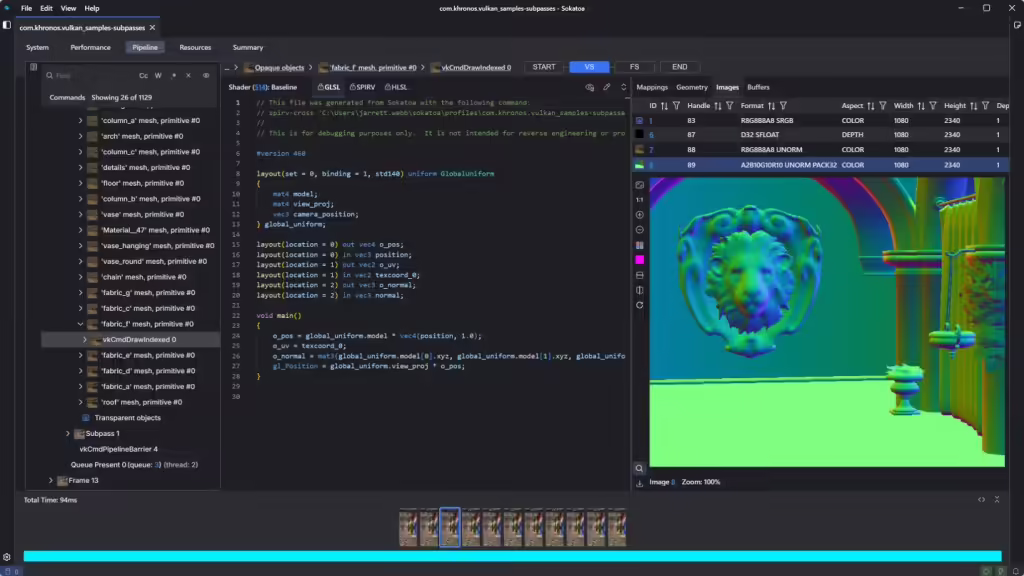 Sokatoa 引入了核心功能“多帧 GPU 分析”,开发者可以同时审查连续多个帧的 GPU 活动,这种全局视角有助于快速锁定性能波动的规律,精准定位导致卡顿的具体瞬间。