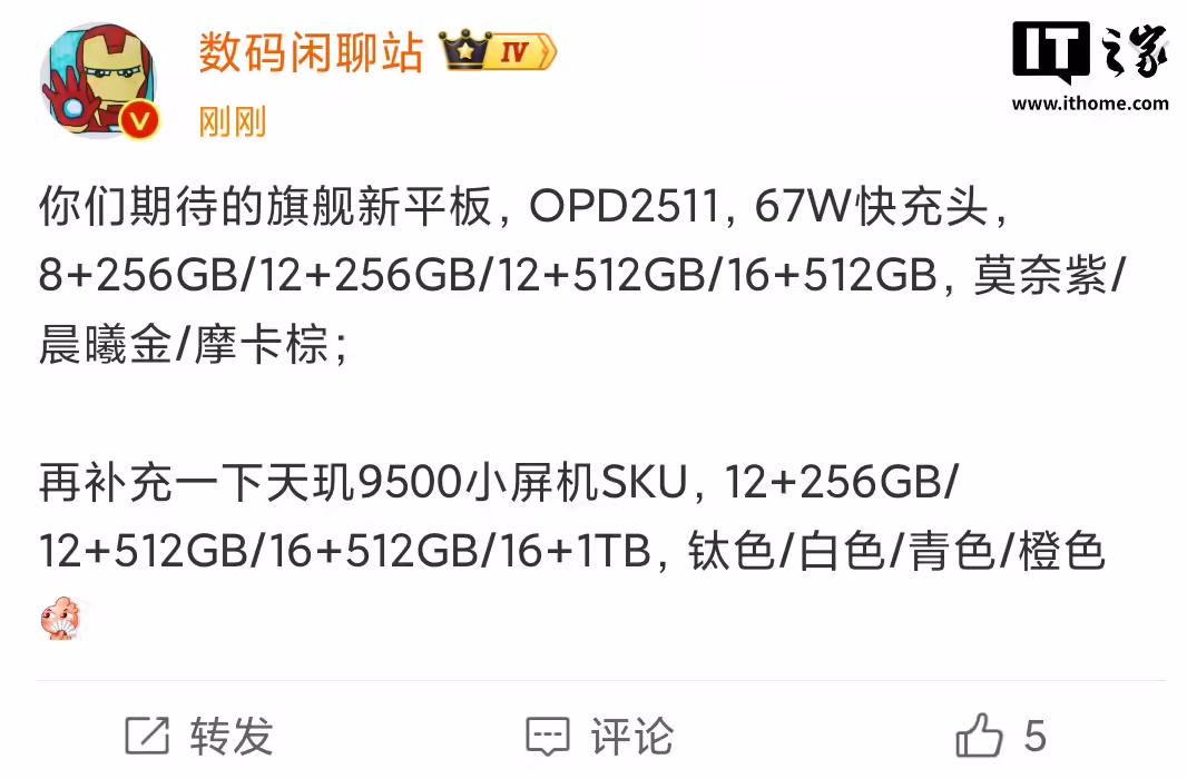 另外,他还提到了另一款可能是 OPPO Find X9s/Pro 的小屏新机。该机将搭载联发科天玑 9500 芯片,提供 12+256GB、12+512GB、16+512GB、16+1TB 四种存储,以及钛色 / 白色 / 青色 / 橙色四种配色。