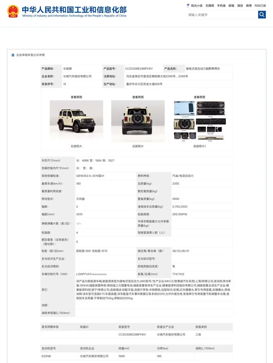 3 月 13 日消息,在问世至今逾 5 年后,长城汽车新款坦克 300 今晚现身第 405 批《道路机动车辆生产企业及产品公告》新产品公示。