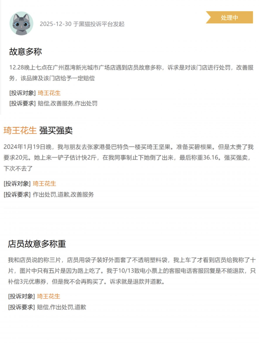 除了高价,琦王花生部分门店还存在“多称”“过度推销”等问题,黑猫投诉平台上,有多起针对琦王花生门店“故意多称”“强买强卖”的投诉,甚至有消费者反映,要求购买20元碧根果,店员一铲子就舀了近两斤。还有不少消费者无奈“倒苦水”:面对店员的热情招待,往往不好意思“斤斤计较”,最终只能为超出预期的价格买单。