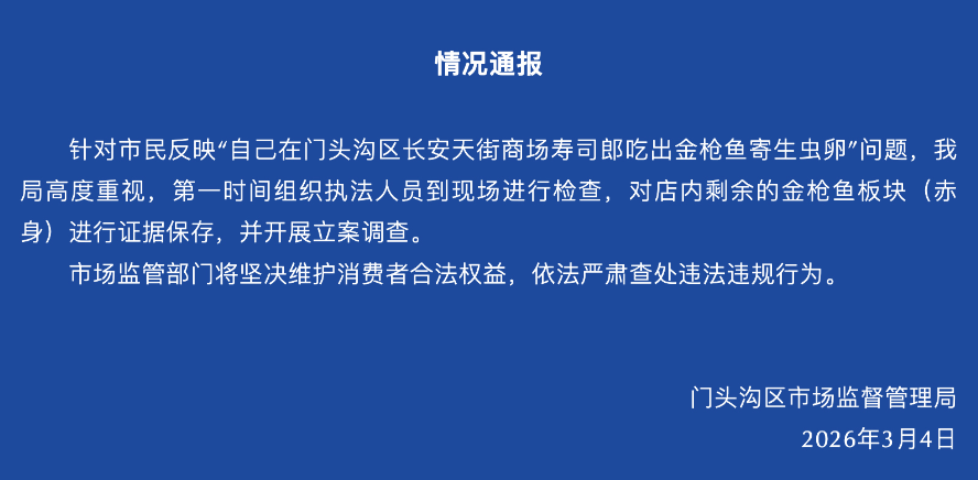 3月4日,北京市门头沟区市场监督管理局发布通报称,第一时间组织执法人员到现场进行检查,对店内剩余的金枪鱼板块(赤身)进行证据保存,并开展立案调查。