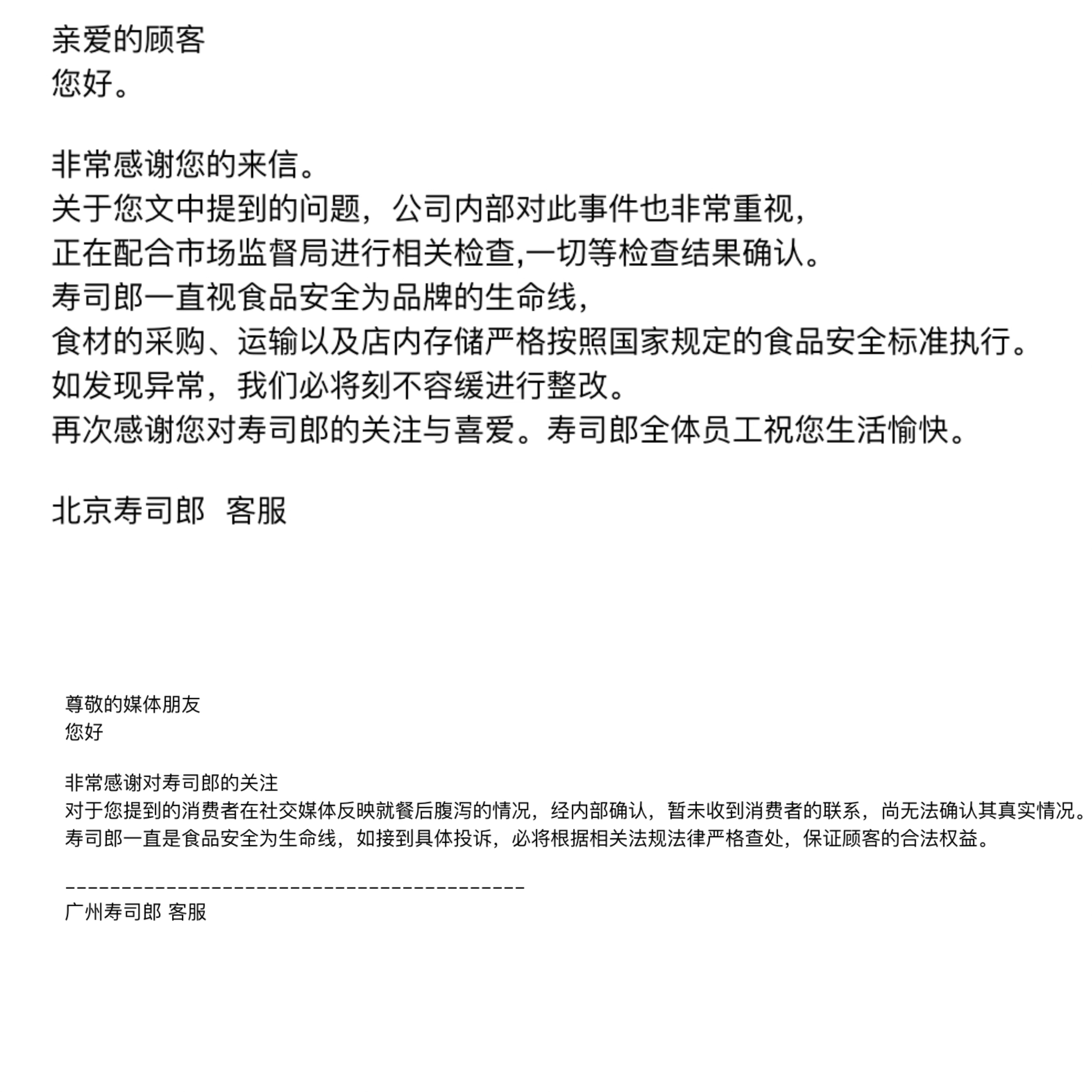记者还向寿司郎公众号公开的北京寿司郎(负责北京等地区门店)、广州寿司郎(负责珠海、佛山等地区门店)服务邮箱发送邮件,咨询相关消费者反馈。