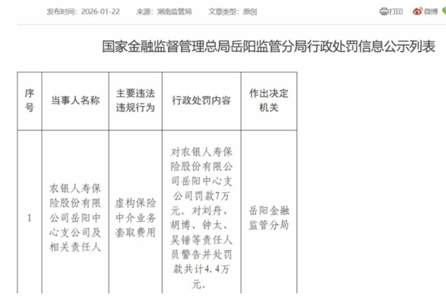 1月22日,农银人寿岳阳中心支公司因“虚构保险中介业务套取费用”,被国家金融监督管理总局岳阳监管分局罚款7万元。相关责任人刘舟、胡博、钟太、吴锤被警告并处罚款共计4.4万元。