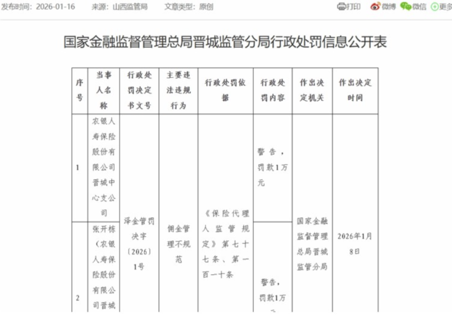 2026年前两个月,农银人寿已收到三张罚单,共被罚8.3万元。其中,1月8日,国家金融监督管理总局晋城监管分局对农银人寿晋城中心支公司开出罚单,因该公司存在“佣金管理不规范”的违规行为,依据《保险代理人监管规定》相关规定,对该公司警告并罚款1万元,同时对时任总经理助理张开栋警告并罚款1万元。