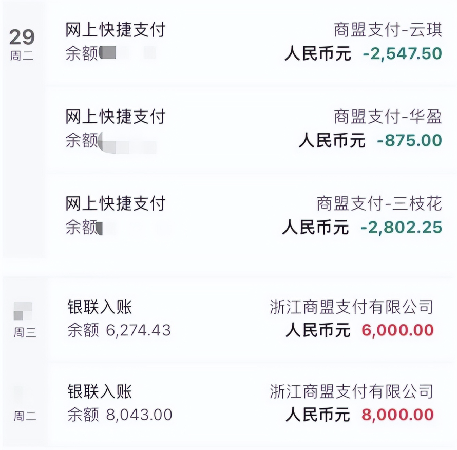 据消费者小薛(化名)反映,其在“三枝花”“星选花”“时常花”“立刻用”等月系融担平台借款,每次都被收取数百元到千余元不等的担保费、服务费。其提供的银行卡交易流水显示,这些平台放款、还款的账户名称均为“浙江商盟支付有限公司”。