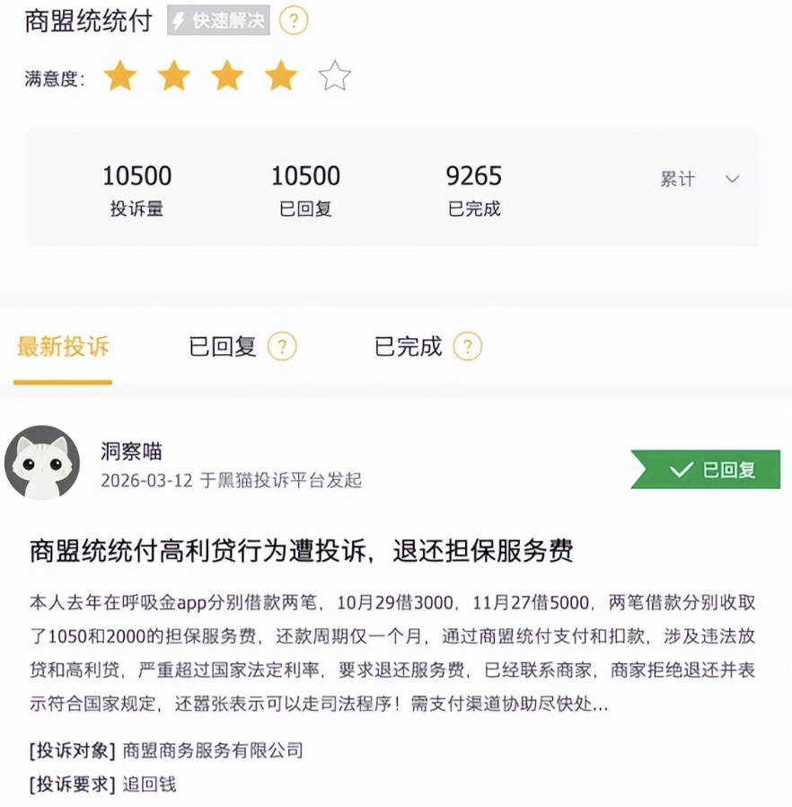 3月12日,有消费者在第三方投诉平台上称:“本人在呼吸金APP借款3000元、5000元,分别被收取了1050元和2000元的担保服务费,还款周期仅一个月,通过商盟统统付支付和扣款。联系商家要退还服务费被拒绝,商家很嚣张表示可以走司法程序,希望商盟作为支付渠道协助处理。”