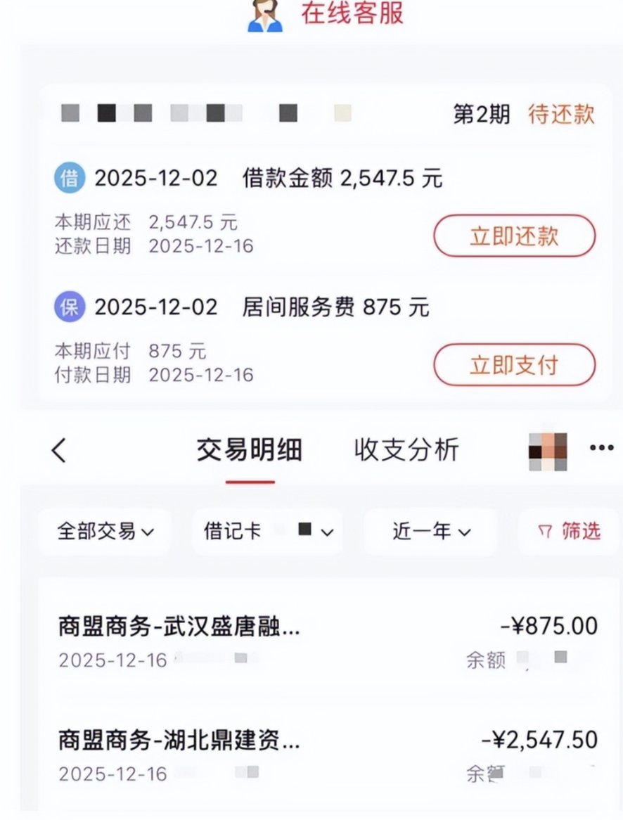 扣款信息显示,每期扣款2547.5元借款本息的账户为“商盟商务-湖北鼎建资…”,对每期875元居间服务费进行扣款的账户为“商盟商务-武汉盛唐融…”。
