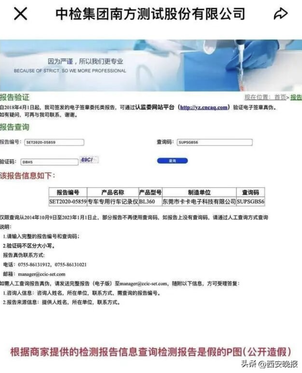 不久后,孙先生收到商家发来的检测报告,“只有首页,其他内容局部提供。”孙先生介绍,为了查证相关信息,他将商家提供的报告查询码在出具报告的中检集团南方测试股份有限公司官网进行查询,却惊讶地发现,查询结果与他购买的商品及型号竟毫不相干,查出来的产品系东莞一家电子科技公司生产的型号为BL360的行车记录仪。“不知道商家给我提供的检测报告是咋来的,很可能是P的图。”孙先生非常气愤,这商家不是明目张胆的造假么!