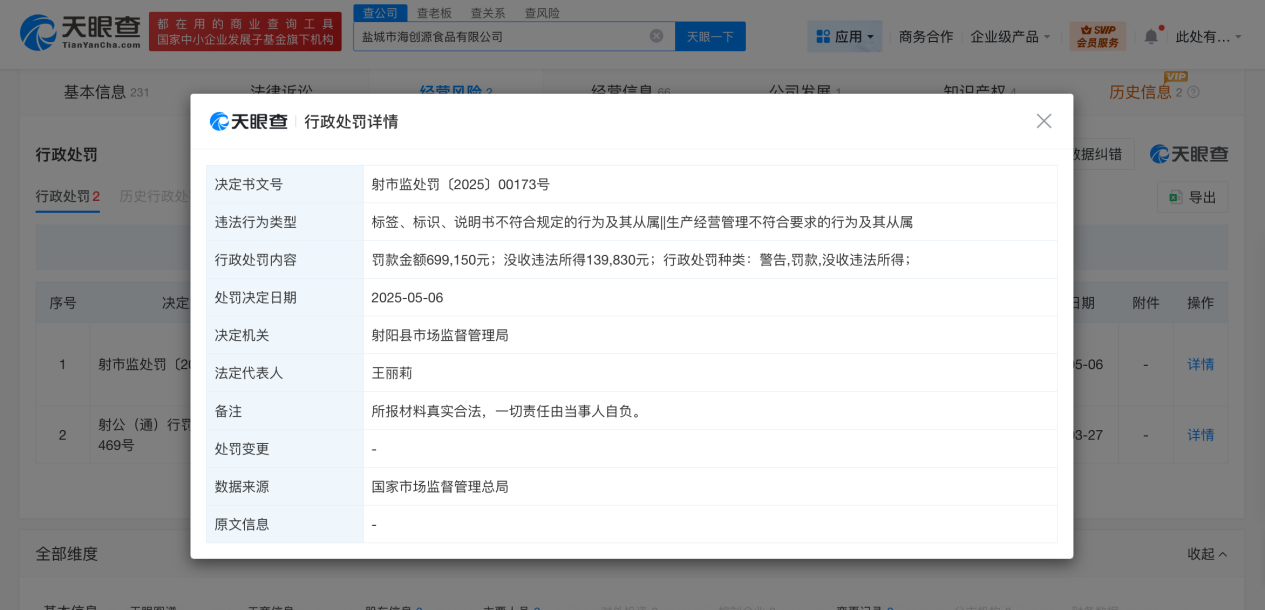 相比之下,食品领域的造假行为迎来了更直接的行政处罚。针对“保水虾仁”增重乱象,盐城市海创源食品有限公司付出了沉重代价。天眼查App显示,该公司于2025年5月因标签标识不符及管理违规,被射阳县市场监督管理局罚款约69.9万元,并没收违法所得约14万元。