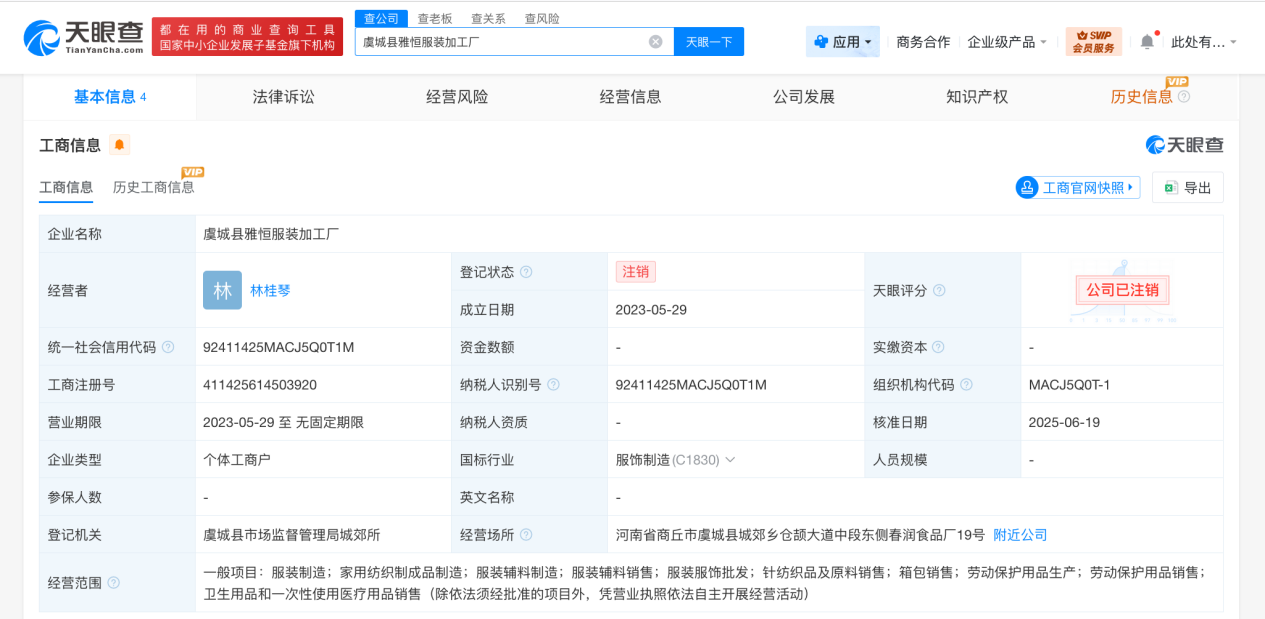 另一家被曝光的虞城县雅恒服装加工厂(经营者林桂琴)则直接走向了终结。这家成立于2023年的个体工商户,目前在天眼查上显示的状态已为“注销”。
