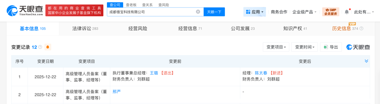 成都借宝科技有限公司则选择了人事大换血。变更记录显示,2025年12月,原法定代表人王璐卸任,由陈太春接任。这种高管变更背后,似乎隐藏着企业试图通过切割责任来应对危机的意图。