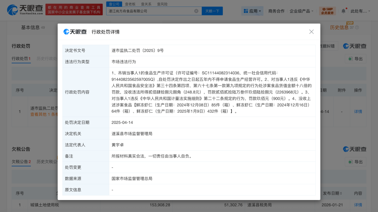 更为惨痛的是湛江尚方舟食品有限公司。天眼查显示,该公司不仅被遂溪县市场监督管理局罚款约226万元,更直接被吊销了食品生产许可证。这意味着该企业彻底失去了从事食品生产的资格,为其违规行为画上了句号。
