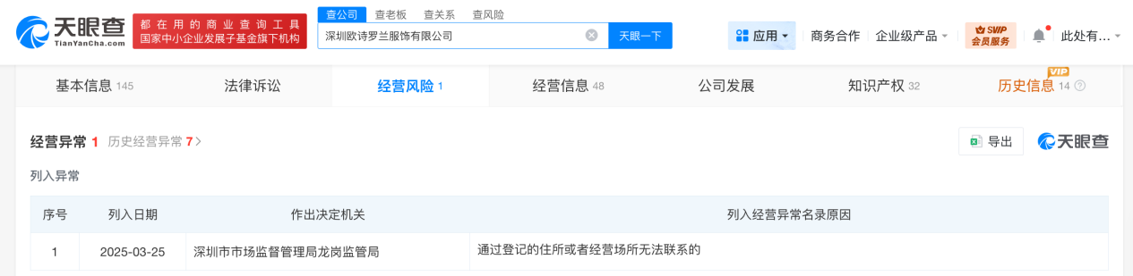 在一次性内裤领域,情况更为严峻。深圳欧诗罗兰服饰有限公司因产品未灭菌被曝光。天眼查信息显示,该公司成立于2018年10月,注册资本300万元,由李军伟、李美霞共同持股。2025年3月,该公司因“通过登记的住所或经营场所无法联系”,被列入经营异常名录。
