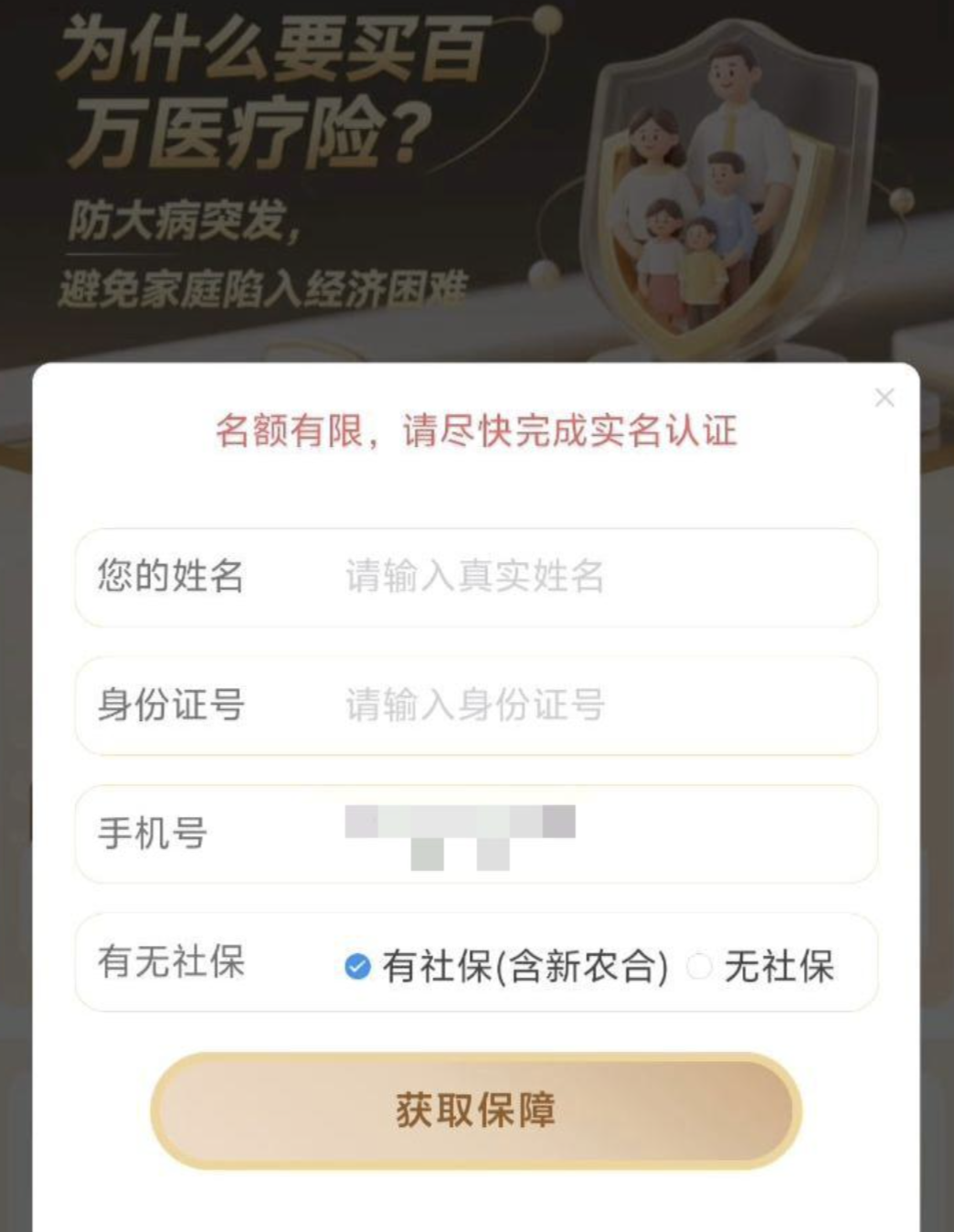 在一个小区底商的无人值守停车场,记者开车进入后停留了1个小时44分钟,准备缴费出场时,记者在停车场出口的岗亭扫描付款二维码,扫码后,付款页面自动弹出一个“5元停车券”的页面,页面上有一行“兑换后本次停车可用”的字样,记者随即点击了该页面上的“确认”按钮,页面跳转到一张写有“开通成功”“赠送发放5元停车券包”的图片,图片下方还有一个“名额有限先到先得”的按钮,记者点击进入后,页面再次跳转,出现“凭手机号限时领取”的提醒,记者输入手机号后,下方的“我已阅读并同意《客户告知书》《用户协议》……”已自动打勾,记者根据页面指引点击了“立即领取”的按钮,页面跳转至一个保险的广告页面,页面需要填写姓名、身份证号,还需要选择有无社保。