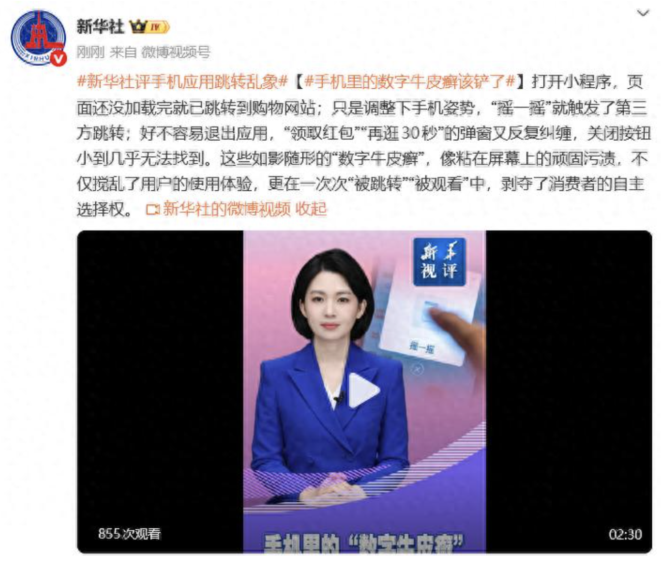 3月14日,新华社发文评手机应用跳转乱象,“手机里的‘数字牛皮癣’,该铲了”: