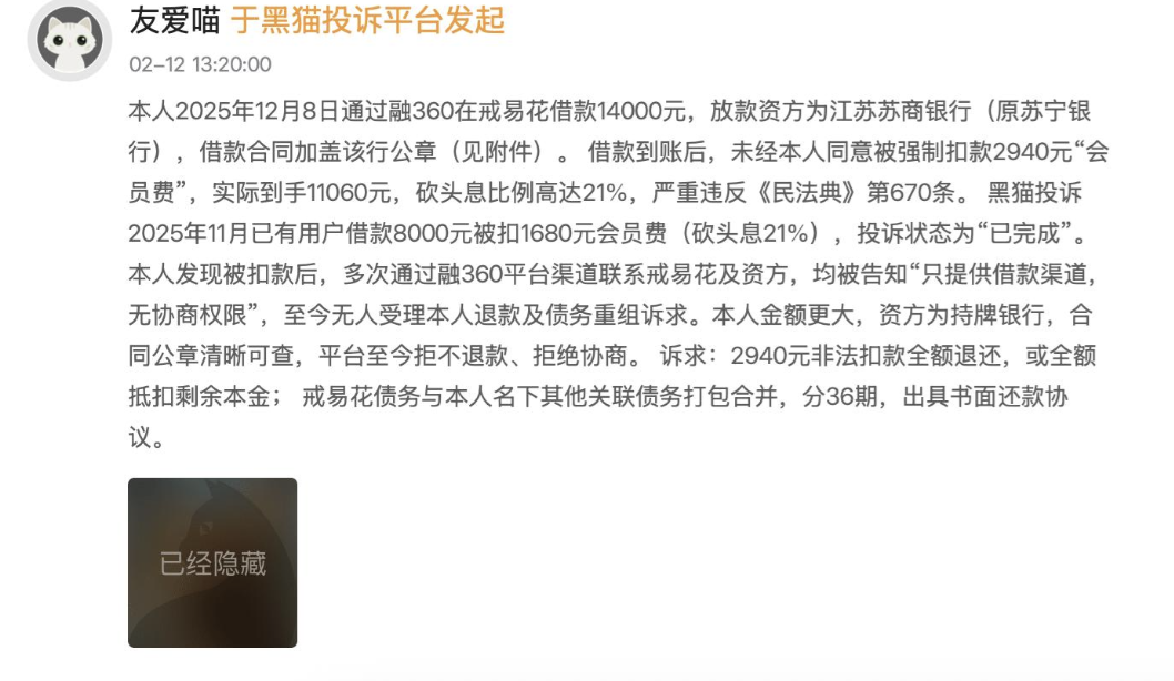 还有消费者直言,“借款14000元,未经本人同意被强制扣除2940元‘会员费’,实际到手仅11060元,砍头息比例高达21%”。据悉,即便被强制扣费,借款人仍需按照借款全额本金还本付息,综合资金成本大幅攀升,不少用户提交的退费、维权诉求,也暂未得到平台妥善处理。