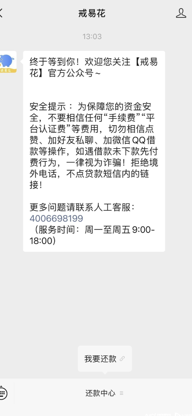 “临阵关服”?近期,有多名金融消费者向南都湾财社记者爆料,戒易花平台关停借款服务,导致维权渠道不畅。为此,南都·湾财社记者多次联系对方客服,最终拨通客服电话后,对方表示,目前平台处于优化升级阶段,公众号页面仅留下还款通道。