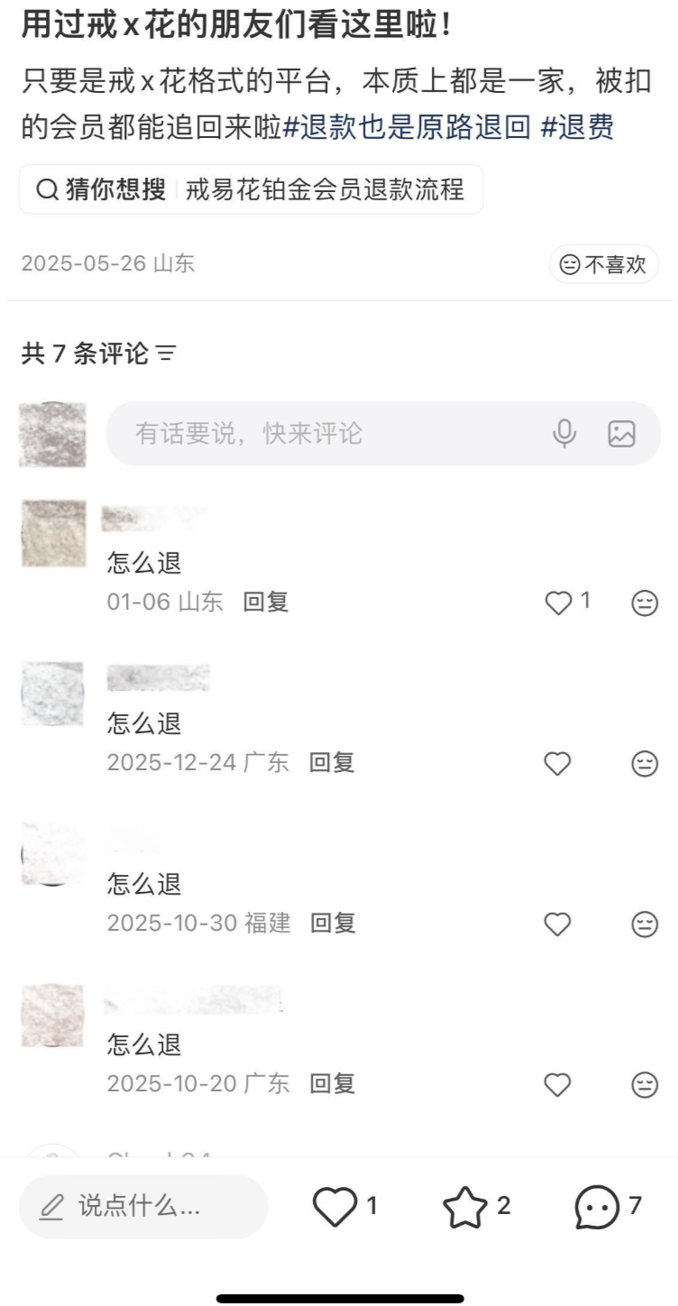 此外,记者在社交平台搜索“戒易花”关键词后,弹出大量会员费退费指南类帖子,发帖人多以“戒易花乱扣权益会员费,成功退回”等内容吸引流量,帖子下方的评论区,满是“求退费方法”“怎么投诉有效”等留言,由此不难看出,此类强制扣费问题并非个例,消费者维权需求十分迫切。